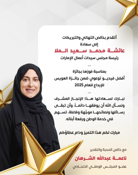 أتقدم بخالص التهاني والتبريكات إلى سعادة عائشة محمد سعيد الملا رئيسة مجلس سيدات أعمال الإمارات...