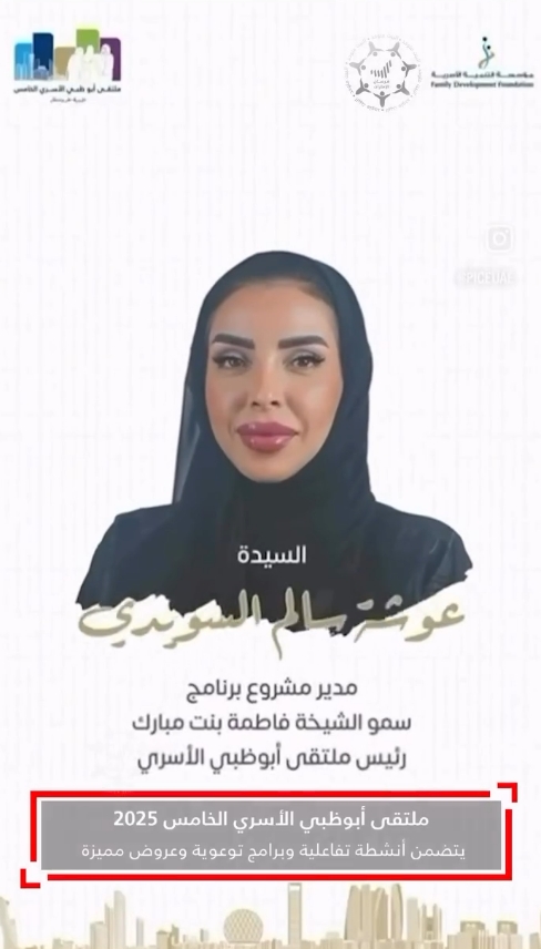 عوشة سالم السويدي، مدير مشروع برنامج سمو الشيخة #فاطمة_بنت_مبارك، رئيس #ملتقى_أبوظبي_الأسري_الخامس: ندعوكم للمشاركة في ملتقى يجمع التنوع الثقافي والإبداعي والمجتمعي، ويتضمن أنشطة تفاعلية وبرامج توعوية وعروض مميزة....