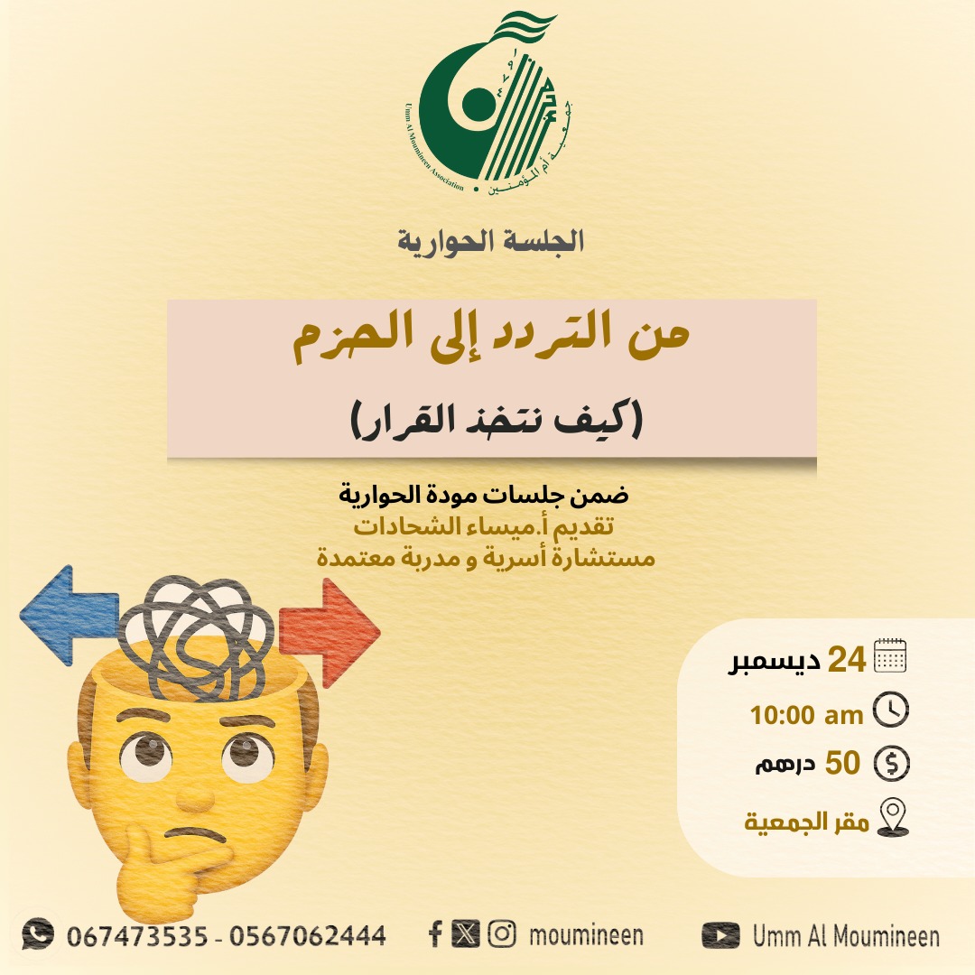 الجلسة الحوارية من التردد الى الحزم (كيف نتخذ القرار ) جلسة ضمن برنامج توجيه ما بعد الطلاق، قدمتها أ.ميساء الشحادات مستشارة أسرية ومدربة معتمدة في مقر الجمعية – عجمان بتاريخ 24 ديسمبر 2025...
