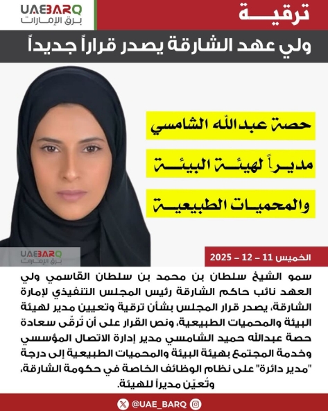 سمو الشيخ سلطان بن محمد بن سلطان القاسمي ولي العهد نائب حاكم الشارقة رئيس المجلس التنفيذي لإمارة الشارقة، يصدر قرار المجلس بشأن ترقية وتعيين مدير لهيئة البيئة والمحميات الطبيعية، ونص القرار على أن تُرقّى سعادة حصة عبدالله حميد الشامسي مدير إدارة الاتصال المؤسسي وخدمة المجتمع بهيئة البيئة والمحميات الطبيعية إلى درجة “مدير دائرة” على نظام الوظائف الخ...